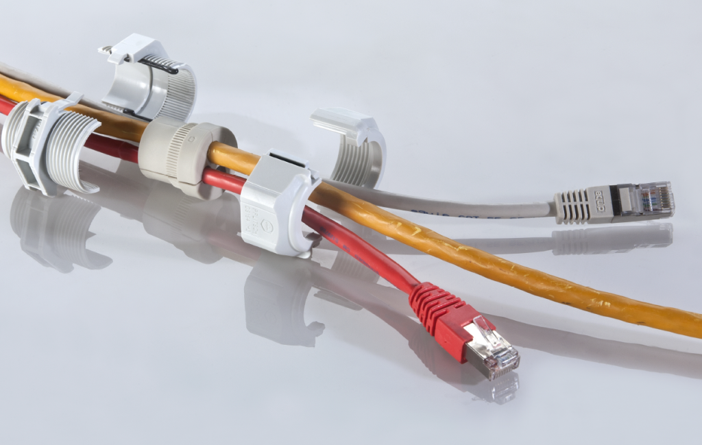 The splittable cable gland from the UNI Dicht system. The cable gland body and the pressure screw consit of two halves, the sealing inserts are slit at the side.